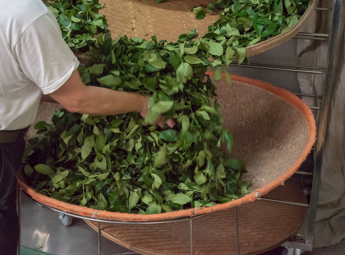 The withering of the leaves can happen outside, usually in the shade, or in such an indoors installation equipped with fans and gas heaters. The advantage of this indoor solution is that it can be used even when it rains, which can be quite useful in northern Taiwan, where short (or long) showers happen frequently.