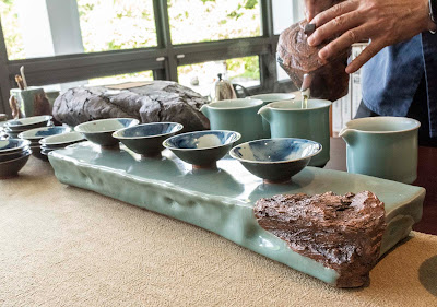 Nous êtions très heureux que M. Lin Chen-Long nous prépare du thé avec les accessoires qu'il a créé lors de notre visite (voir l'article précédent). Mais Teaparker ne voulait pas que nous venions les mains vides. Et comme il y a un superbe jardin devant la galerie de ce céramiste Taiwanais, chacune de ses classes a disposé un Chaxi! Voyez les trésors de créativité et d'harmonie que les élèves de Teaparker ont démontré: